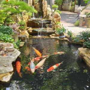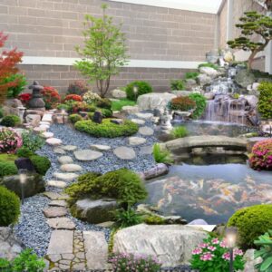 Ví dụ: Một hòn non bộ lớn với thác nước đổ xuống hồ cá Koi, cây xanh và đá tự nhiên, được đặt ở vị trí trung tâm của sân trước nhà.